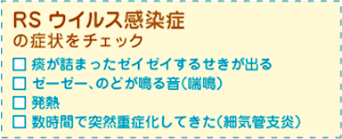 RSウイルスは毎年、冬から春に流行するウイルスで気管支炎、細気管支炎、肺炎などを起こす代表的なウイルスです。RSウイルスは乳児の70%が1歳までに感染を受け、3歳までに100%かかるとされます。成人や年長児でもかかりますが、新生児や生後6か月以内の乳児は細気管支炎など下気道感染症を起こして重症化しますから注意が必要です。